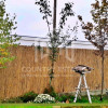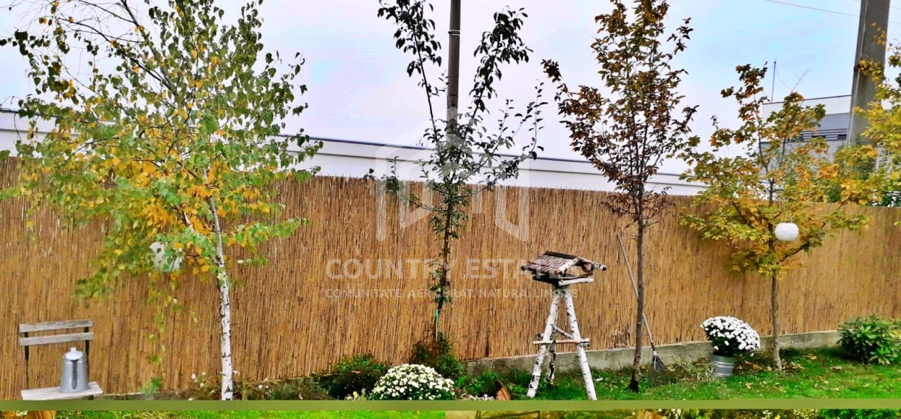 -gradina cu gazon si copaci de padure, tuia, brazi, salcie, plante ornamentale si trandafiri de jur-imprejurul gardului perimetral,